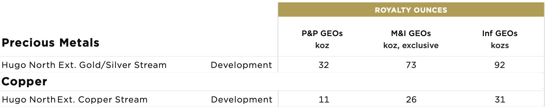 Just based on royalty ounces in reserves at Lift 1, there are 43,000 GEOs. If you include all of the resources from the Hugo North extension, which includes Lift 2, it's an additional 200,000+ GEOs. NPV (5) = ~US$80 million (Lift 1 and Lift 2 only)