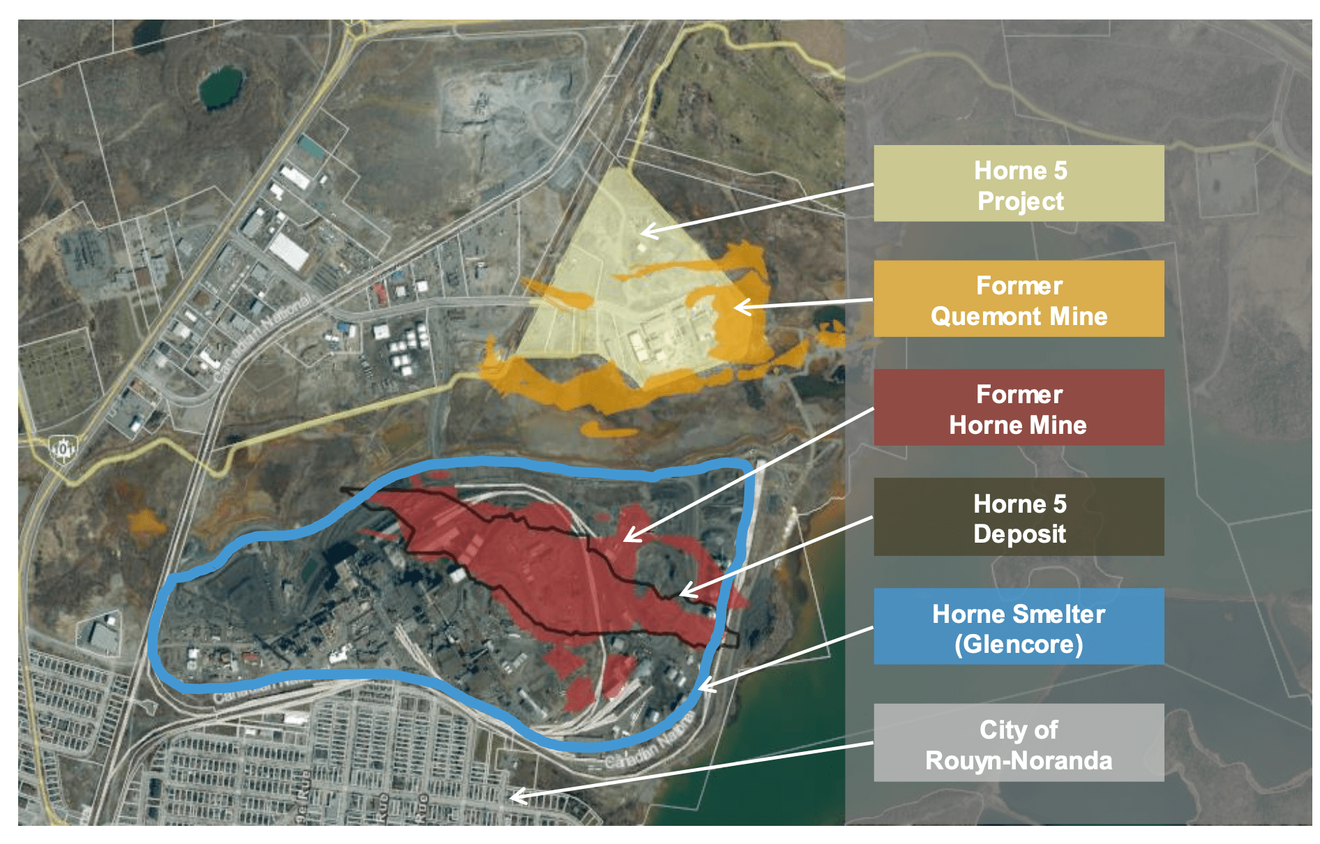 The Horne 5 deposit resides beneath the Horne smelter and below the old Horne Mine, operated by Noranda from 1926 to 1976. Glencore owns the smelter, and this agreement sets the rules so that the Horne 5 operation doesn't interfere with its operation.