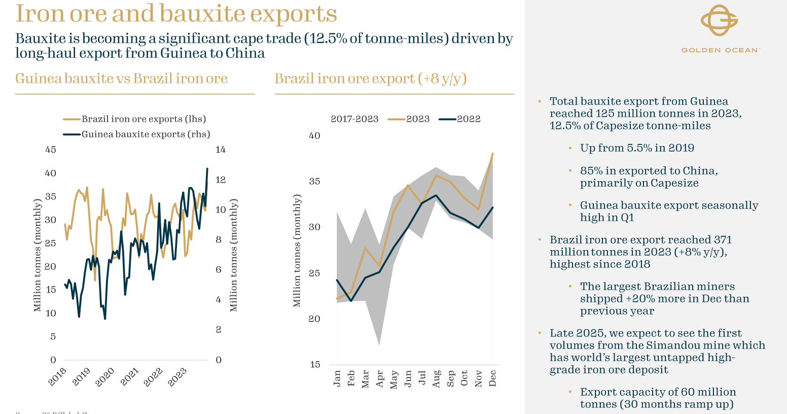 The company is one of the leading players in the Capesize/Newcastle segment, which is, in my opinion, the hottest niche in the bulk market. Those ships carry major bulks such as bauxite, iron ore, and coal. The table below shows the increase in iron exports from Brazil and bauxite exports from Guinea.