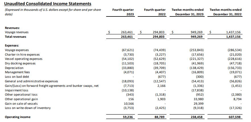 The primary driver behind the lower profits was the weaker TCE rates compared to 2022. The expenses remained relatively stable annually and quarterly.