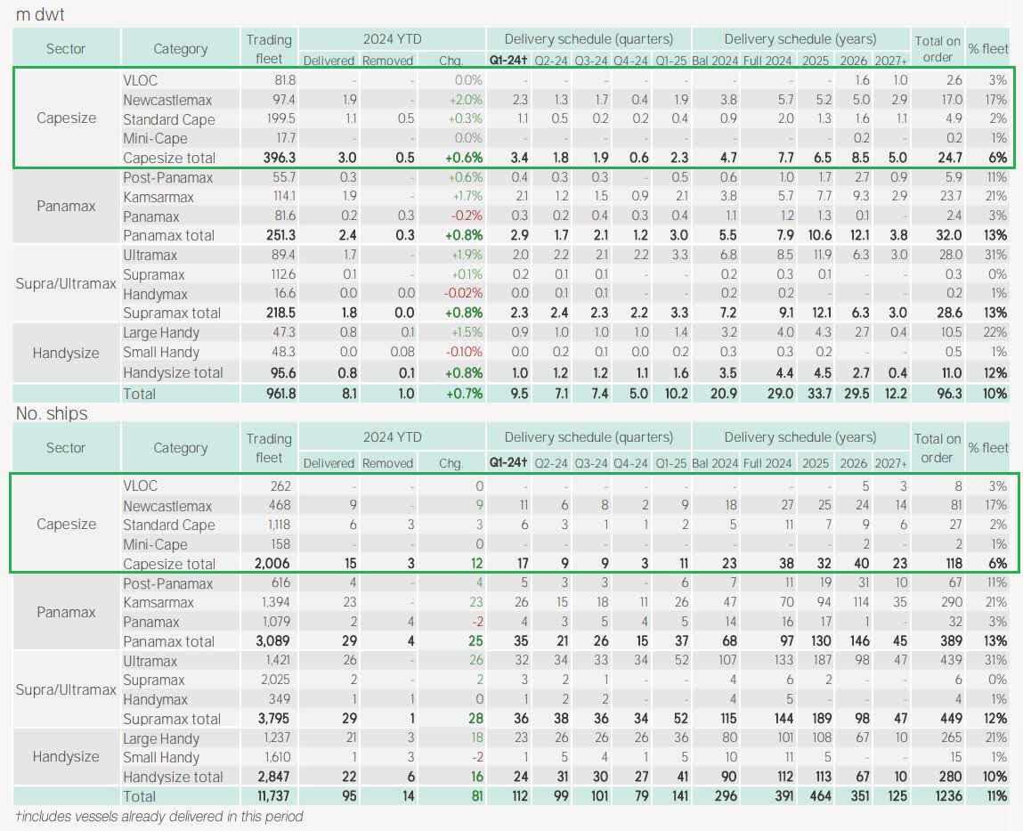 The table is divided into two sections. The top shows the global fleet as total dwt, while the bottom shows the number of ships. As seen in the right column, named ''% fleet'' Capesize segment has the lowest order book, 6%, as a percentage of the current fleet. For reference, Panamax, Supramax, and Handysize have order books in the low teens.