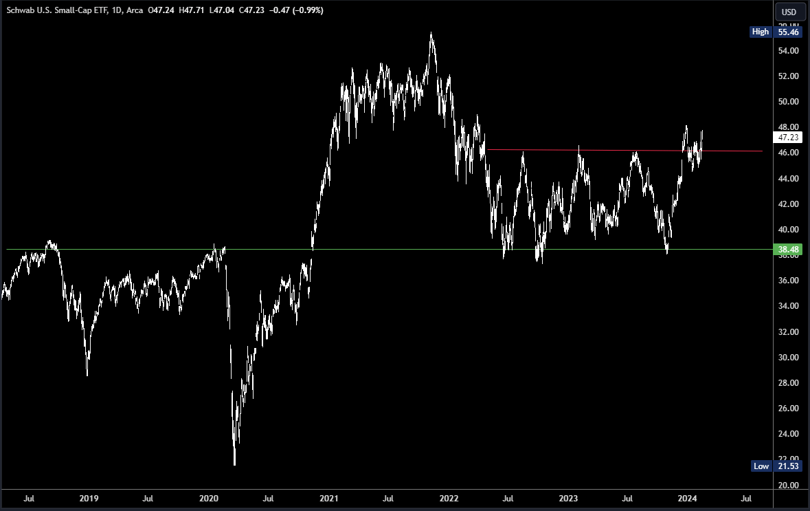 The December 2023 monthly close was at $47.24 so if SCHA can close February just slightly higher, it would be the highest monthly close since March 2022. If it can close above $47.36, it would be the highest monthly close since December 2021.