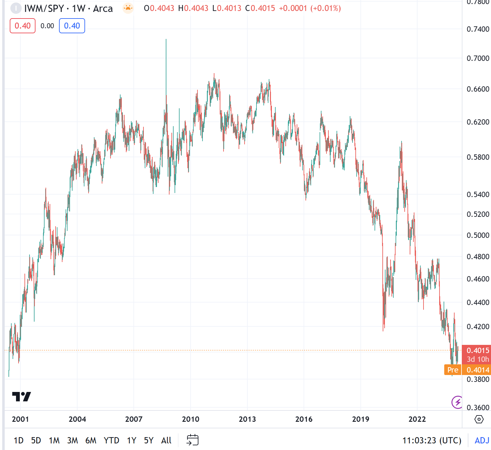 To me, this is more of an allocation question than a fund question. The sole reason why it's been a large-cap-only world is because of the contribution of a select number of large-cap tech stocks driving large-cap momentum disproportionately, as many stocks beneath the surface of a smaller market-cap are still way below their respective 2021 peaks. When I look at the price ratio of the Russell 2000 ETF (IWM) relative to the S&P 500 ETF (SPY), the relationship is back to March 2000 levels - just when the large-cap blow-off Tech bubble took place. Small-caps then proceeded to outperform large-caps over the next 11 years.