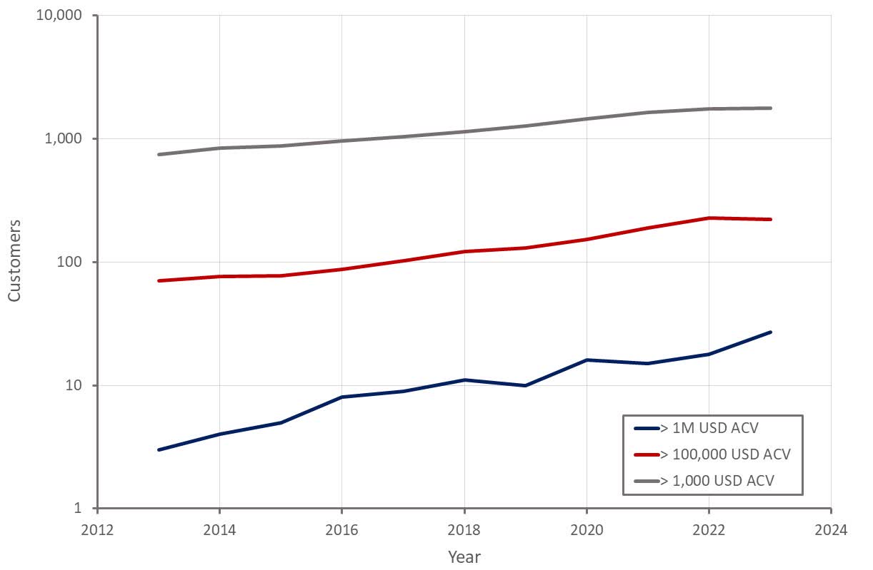 Growth amongst larger customers still appears to be solid but has softened amongst smaller customers. The average contract value for customers with ACV greater than 5 million USD increased to 6.7 million USD in 2023.