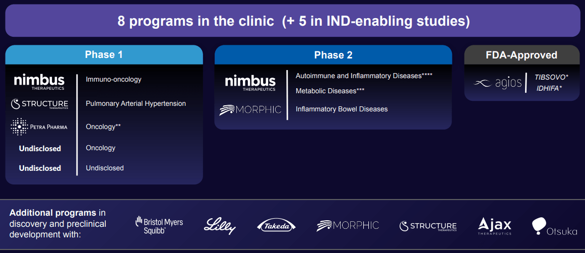Schrodinger expects data from its first two studies in late 2024 or 2025 and is on track to progress a third program into the clinic this year. Schrodinger also expects to submit an IND from its discovery portfolio in 2025.
