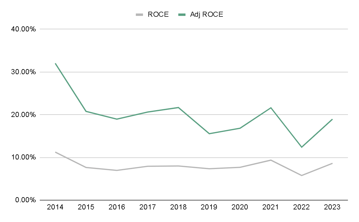 If we adjust this ratio by excluding goodwill, assuming a scenario where the company ceased acquiring companies regularly, the ratio would have averaged 20% over the last decade. This is a highly profitable business.