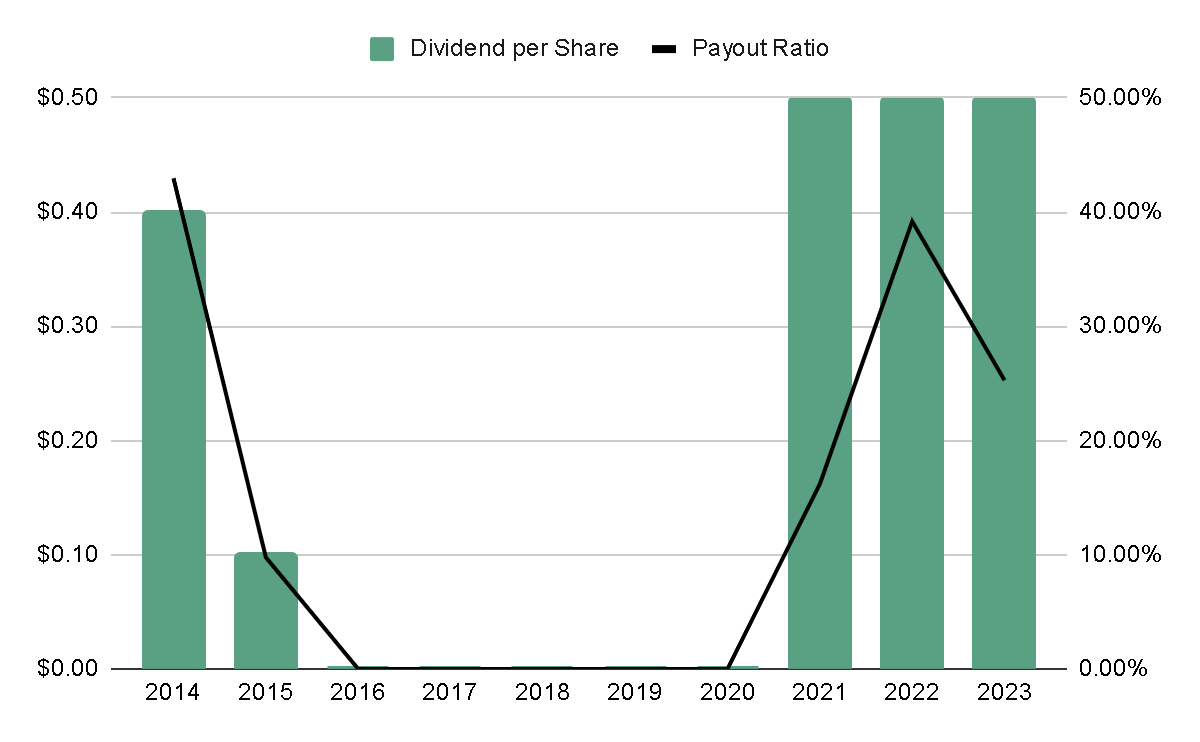 Currently, the company pays a dividend with a yield of 1.8%, which is appealing and only represented 25% of the Net Income of 2023. However, management isn't very interested in maintaining or growing this dividend, and it's more of a source of returning value to shareholders occasionally and as long as the company doesn't see another way to allocate that capital