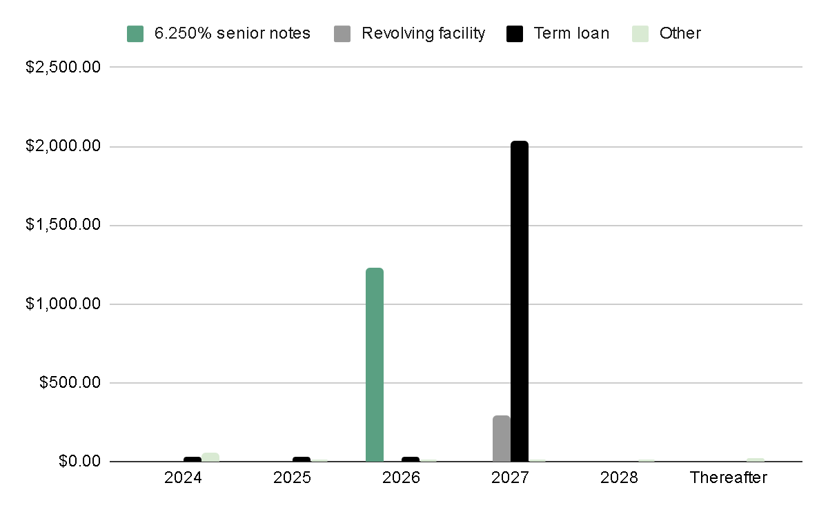 Digging deeper into the debt structure, 97% of it is in a term loan and senior notes, with maturities ranging between 2026 and 2027. This implies that the company has a window of two to three years to explore ways to reduce leverage levels before needing to renegotiate the debt.