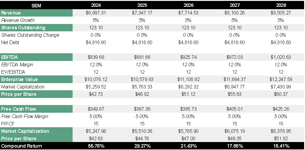 As I mentioned previously, I made the choice of the multiple of 12x EBITDA and 15x Free Cash Flow based on the average multiples since 2010. In the case of SEM, these are usually above 10x EV/EBITDA and although USPh is usually quoted at double from this, I think debt risk causes SEM to maintain a lower valuation multiple.