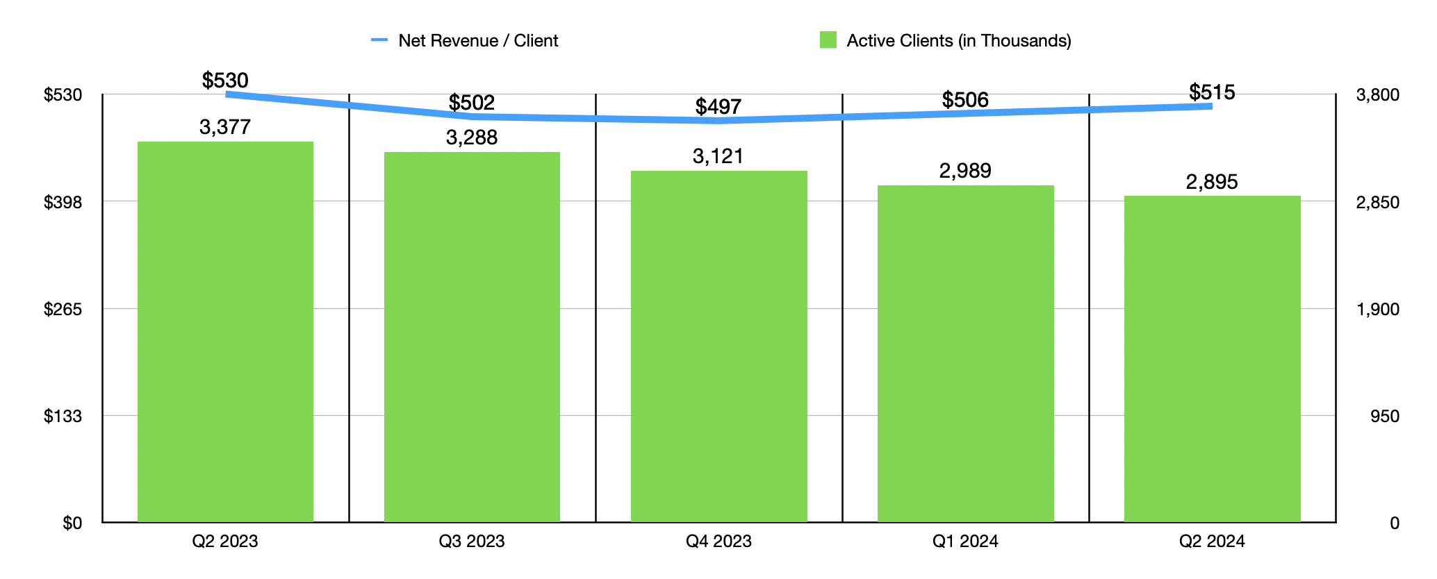 Another driver behind this drop was a reduction in net revenue per client. In the second quarter of the 2023 fiscal year, the net revenue per client was $530. For the second quarter of 2024, the reading came in at $515. Although this drop is painful to see, there was a bit of good news on this front. The $515 reported by management is actually the highest the company has seen in net revenue per client since the same quarter last year. As you can see in the chart below, net revenue per client actually plummeted to a low of $497 in the final quarter of the 2023 fiscal year. Since then, things have been on a constant upswing. This is not to say that the trend will continue. But it does suggest that management is moving in the right direction on that front.