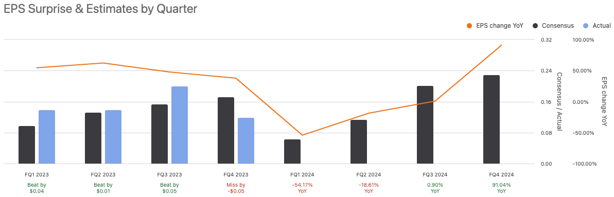 We can also see from the above chart that normalized EPS estimates for the next two quarters are expected to show significant YoY EPS contractions, particularly in the first quarter. However, even though it missed expectations in Q4 of fiscal 2023, it should be noted that its quarterly revenue of $130.4 million was a 38% YoY growth. It has also noted its backlog and awarded orders increasing 47% YoY to $631.3 million.