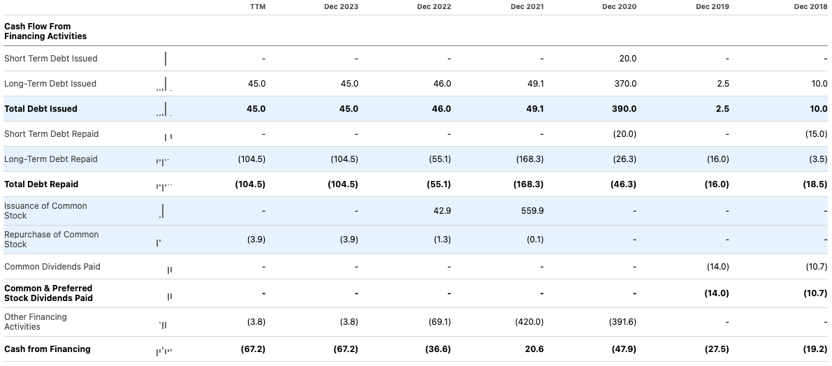 This evidently puts Shoals in a position of significant financial advantage, so I delved deeper into the balance sheet to ascertain just how strong it might be. What I found was a company that looks to me to be careful in how it receives financing, with two notable large financing occasions since 2018; one was a $559.9 million issuance of common stock in 2021, and the other was a $390 million issuance of debt in 2020. Other than this, the company has been very reserved in diluting shareholder value and adding leverage to the balance sheet. In addition, its debt repayments are annual and large following its high issuance of debt in 2020.