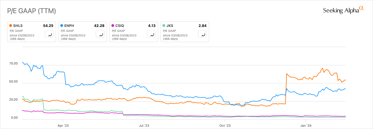 While Shoals is trading at a high price-to-earnings ratio of around 54 based on GAAP, this goes down considerably to around 29 on a forward basis. To start, we can compare its TTM GAAP P/E ratio to the peers I have used in my competitive analysis: