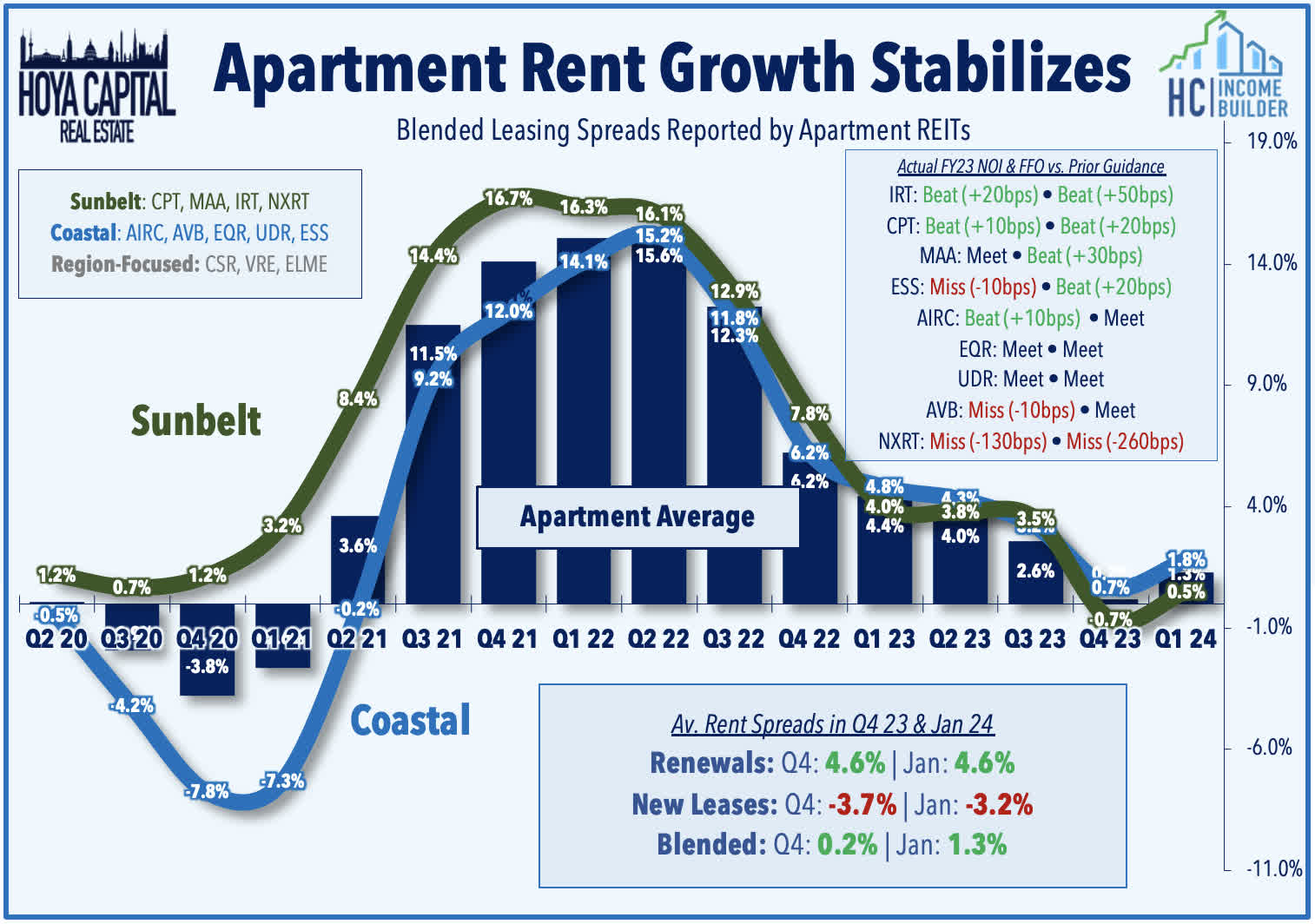 Apartments: Multifamily REITs were among the leaders this week with average gains of 5% after an encouraging slate of business updates presented at the Citi Global Property Conference showed a rebound in rent growth in early 2024 from the near-zero growth reported in Q4. Coastal-focused AvalonBay (AVB) rallied nearly 5% after it reported that blended leasing spreads accelerated in February to 2.4% - up from 1.3% in Q4 and in January - and noted that renewal offers for March and April 2024 are being delivered to residents at an average increase of 5.0%. Sunbelt-focused Camden Property (CPT) rallied 6% after it reported steady occupancy rates and a moderation in bad debt in early 2024, which offset relatively weaker leasing trends, with blended spreads of -2.0% in February - down from -0.5% in January and -0.8% in Q4. Camden noted that it would be even more aggressive on new lease pricing. Meanwhile, Independence Realty (IRT) rallied 5% after it announced that it earned an investment-grade credit rating from Fitch, which assigned it a ‘BBB’ rating with a stable outlook. An important milestone for small- and mid-cap REITs, IRT joins a cohort of seven larger apartment REIT peers that have an investment-grade credit rating.