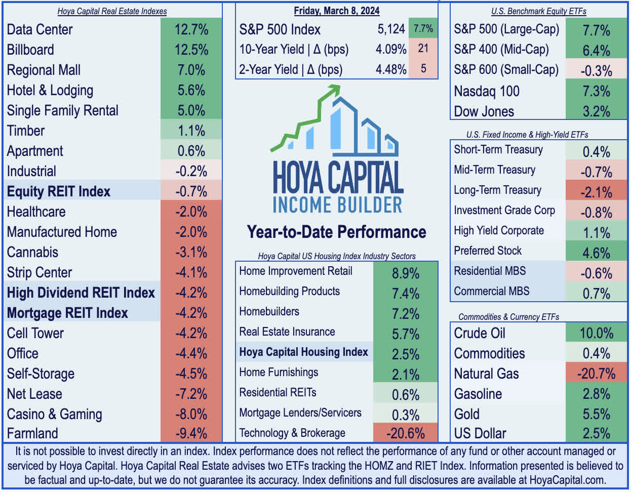 Through ten weeks of 2024, real estate equities have lagged the broader equity benchmarks following a powerful year-end rebound in 2023. The Equity REIT Index is lower by -0.7%, while the Mortgage REIT Index is lower by -4.2%. This compares with the 7.7% gain on the S&P 500, the 6.4% gain for the S&P Mid-Cap 400, and the -0.3% decline for the S&P Small-Cap 600. Within the REIT sector, 7 of the 18 property sectors are higher for the year, led on the upside by Data Center, Billboard, and Regional Mall REITs, while Net Lease and Farmland REITs have lagged on the downside. At 4.09%, the 10-Year Treasury Yield is higher by 21 basis points on the year, while the 2-Year Treasury Yield has risen 5 basis points to 4.48%. Following a late-year rally in the final months of 2023, the Bloomberg US Bond Index is lower by -0.5% this year. WTI Crude Oil is higher by 10.0% this year, lifting the broader Commodities complex higher by 0.4% on the year.