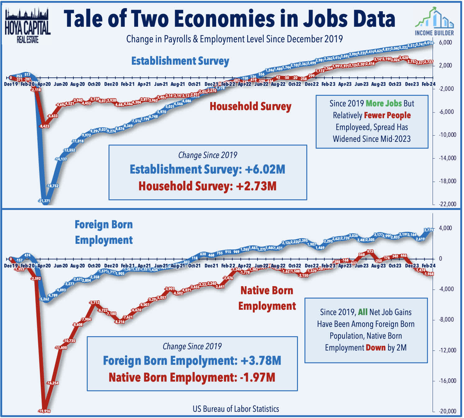 The Household Survey - which is used to calculate unemployment metrics - has been considerably weaker than the Establishment Survey - which is used to calculate the "headline" job gains. The Household Survey - which admittedly has been quite noisy and has given several "false alarms" - posted a third-straight month of declines, which led to a rise in the unemployment rate to 3.9% from 3.7%. The Household Survey also showed some rather remarkable splits in job gains between Native and Foreign-born workers. While it's again worth noting that the BLS' population-characteristics metrics are prone to large revisions, the report this week showed that the foreign-born employment level rose by 1.16M in February, while the native-born population level plunged by 494k during the month. Longer-term trends show that all of the net job growth since 2020 has come via foreign-born workers, while the native-born population has lost nearly 2 million jobs over the past four years.