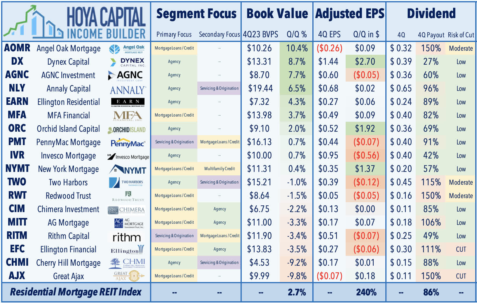 On the downside this week, Cherry Hill (CHMI) dipped 7% after its results showed the potential downside and cost of traditional interest rate hedges if and when rates move sharply in the opposite direction. CHMI noted that it was positioned for a "higher for longer rate environment" with a negative duration portfolio and was "surprised by the Fed's sudden shift in policy" towards rate cuts in 2024. Despite the positive performance in its underlying RMBS book, CHMI reported that its BVPS dipped 9.2% in Q4 - the second-worst among mREITs this earnings season. Positively, CMHI did report that its distributable EPS rose to $0.17 - up from $0.16 last quarter - which covered its $0.15/share quarterly dividend. CHMI also indicated that it has benefited from the reversal in the rate movement in early 2024 which "aligns with how we initially positioned our portfolio."