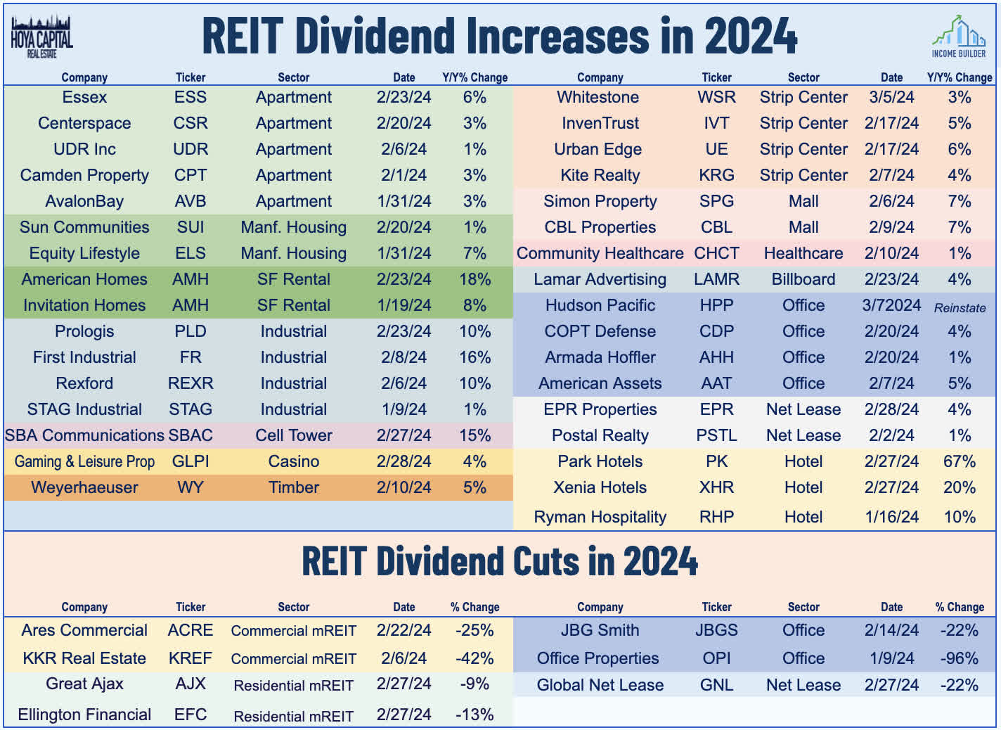 This week, we published Winners of REIT Earnings Season - Part 1 of our two-part REIT Earnings Recap. We noted that upside surprises this earnings season came largely from the service-oriented pro-cyclical property sectors - retail, hotel, and specialty REITs. An easing of expense pressures and stable tenant financial health lifted healthcare and cannabis REITs as well. Fittingly, in the "AI-generated" earnings season in which technology stocks bifurcated from the rest of the market, Data Center REITs delivered the strongest price returns despite mixed earnings results. The single most economically-sensitive property sector, billboard REITs have been beneficiaries of the so-called "No Landing" scenario of 3-4% inflation and economic growth. Positively, we've tracked more than two dozen REIT dividend hikes this earnings season, including a pair of increases this week. West Coast-focused office REIT Hudson Pacific (HPP) soared nearly 10% after it reinstated its dividend, which had been suspended since mid-2023 as it faced a double-whammy of office weakness and strike-driven shutdowns at its movie studio properties. HPP's declared a $0.05/share quarterly dividend (3.0% dividend yield). Strip center REIT Whitestone (WSR) also raised its monthly dividend by 3% to $0.04125/share (4.0% dividend yield). We've now seen 31 REIT dividend hikes this year, while seven REITs have reduced their dividends - most of which have resulted from office-related headwinds.