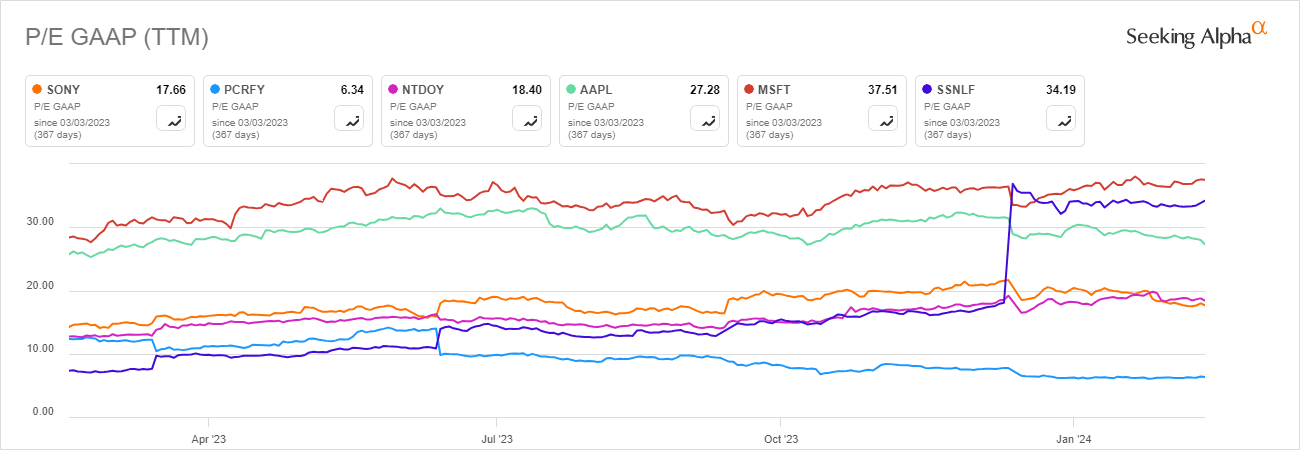 P/E ratios meanwhile tell a similar story, with Sony again in the middle of the grouping, though technically second lowest currently and a tad lower relatively.
