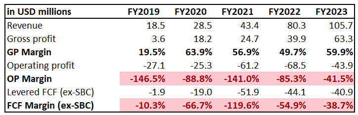 As usual, I am starting by zooming out and analyze key trends in financial performance over longer timeframes. Since SPIR went public relatively recently, the last five fiscal years is the longest available horizon. But it looks sufficient. Starting from a low base of below $20 million revenue in FY 2019, SPIR delivered a 55% topline CAGR. The gross margin is around 60% and the trend is positive. The operating loss is massive in relative terms, but the trend is also positive. It is also crucial to understand that operating in space industry means substantial investments in innovation and science.
