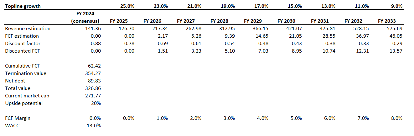 Due to the company's size and substantial level of uncertainty regarding profitability timing I am using an elevated 13% WACC. I use FY 2024 revenue consensus estimates, project a 25% revenue growth in FY 2025 with further two percentage points yearly deceleration. All in all, the next decade's CAGR is projected at 17%, which looks fair considering the 55% CAGR over the last five years. I expect zero FCF margin for FY 2024-2025 and the metric to start expanding by one percentage point yearly starting from FY 2026. I also subtract the net debt figure from my fair value calculations.