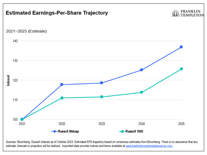 Lastly, estimated earnings per share of mid-cap firms are expected to rise by about 10% more than large caps by 2025.