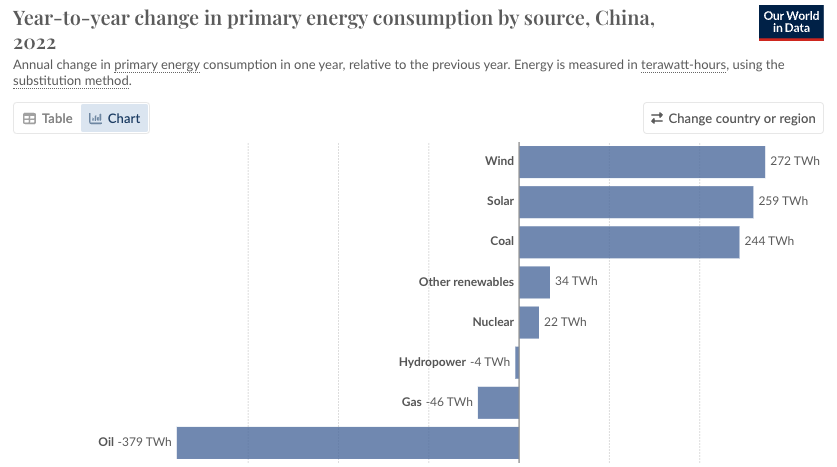 China’s data shows that while coal use increased in 2022, new wind and solar produced more power than coal and there was a decrease in gas use and a more striking decrease in oil use.