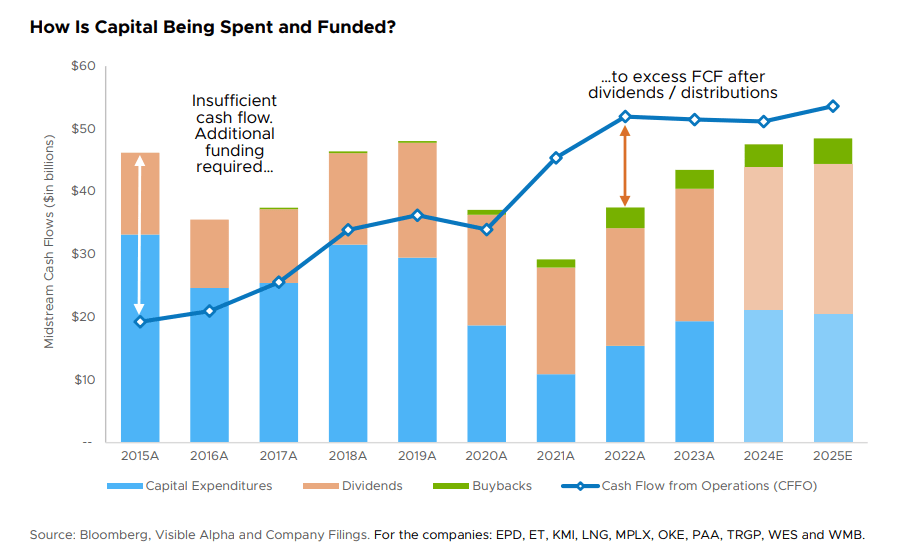 In previous years, the midstream sector was very capital intensive and relied on high leverage and capital spending that far exceeded the cash flow generation of the assets. In more recent years, there has been a transformation to more disciplined capital expenditures that are mostly internally financed and have led to more robust cash flow generation. Those cash flows are largely uncorrelated to larger market forces such as commodity prices, macroeconomic issues (i.e. interest rates, inflation), or higher valuations.