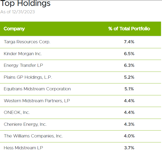 The fund’s top holdings are all top performers in the midstream sector and the top 10 make up about 60% of the total portfolio holdings, which include about $110M in AUM as of 12/31/23.
