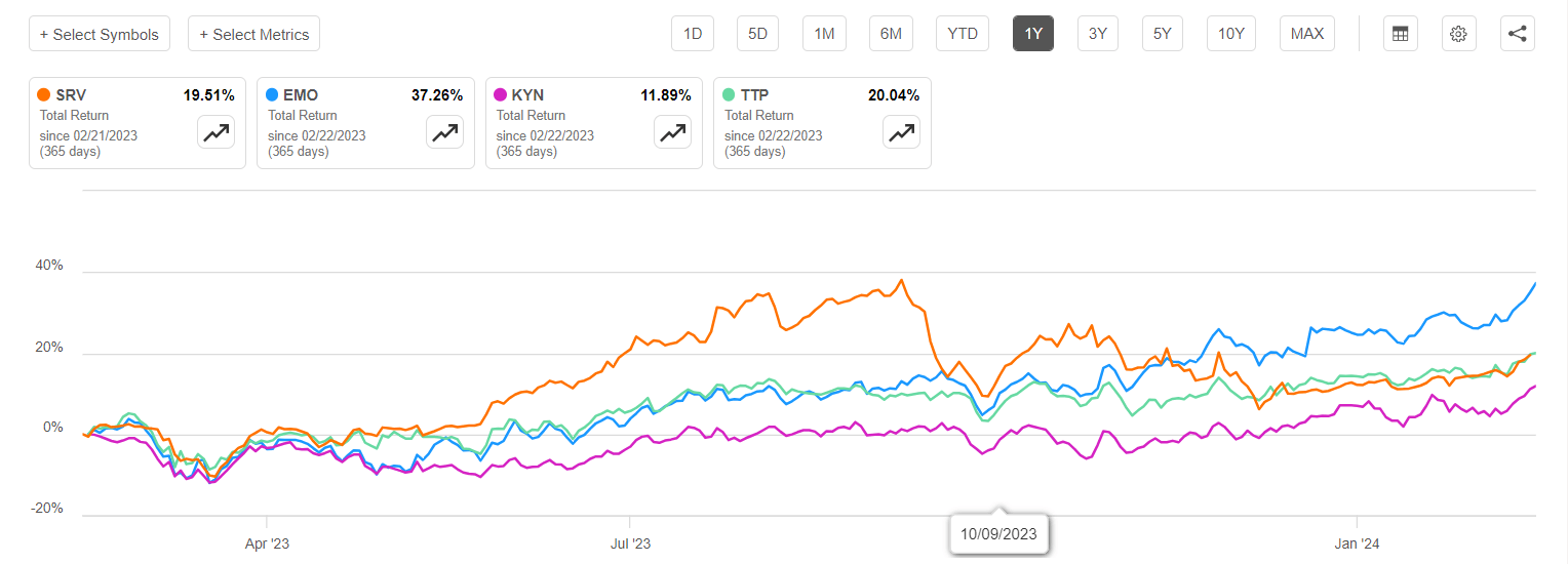 Investors in MLP and midstream companies may be more familiar with other CEFs that invest in the midstream sector, and in my previous article I included a comparison with three peer funds: KYN, TTP, and EMO. In the past year, which is roughly the time since I last covered SRV, the total return of all 4 funds has been comparable with EMO now in the lead for highest total return, however, SRV offers the highest distribution yield (by far).