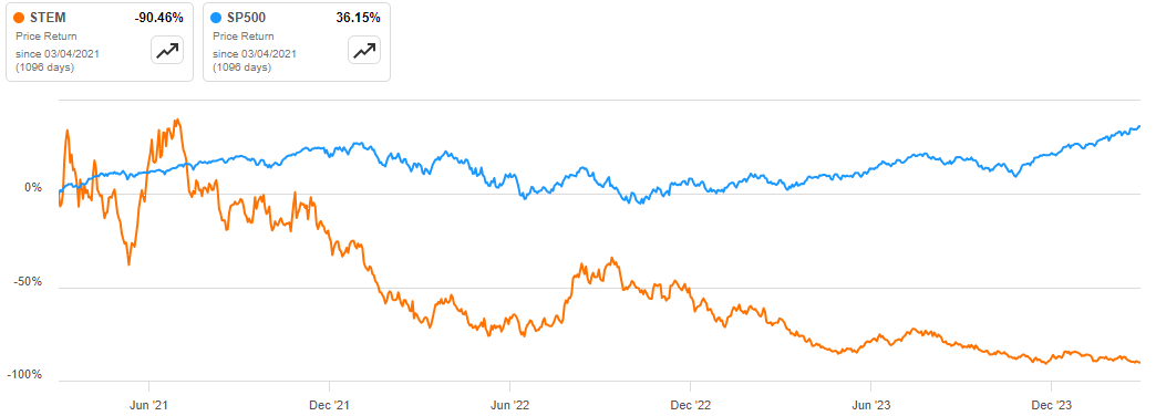 Stem, Inc. (NYSE:STEM) is a company that specializes in AI-driven clean energy solutions and services. Its stock has slumped since reaching its highs of the low 50s. It has lost about 90.46% over the last three years, underperforming the S&P 500 by a margin of about 126.61%.