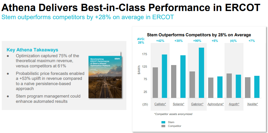 Further, the company enjoys a backlog of about $2 billion which provides more visibility in its earnings possibilities in the future. In addition, Stem has a strong demand for its Athena PowerBidder Pro which I believe will keep driving future growth because it is helping the company beat competition. Athena helped the company outperform its competitors by more than 28% in ERCOT.
