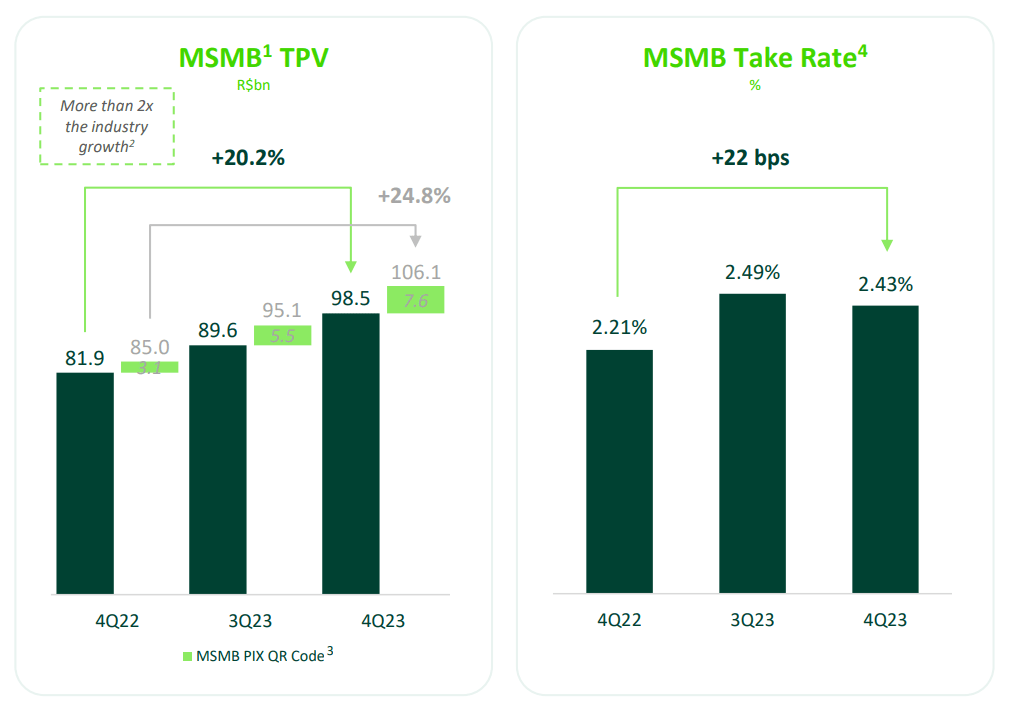 StoneCo was able to further increase its pricing throughout the year to a take rate of 2.43%, while total payment volume increased further.