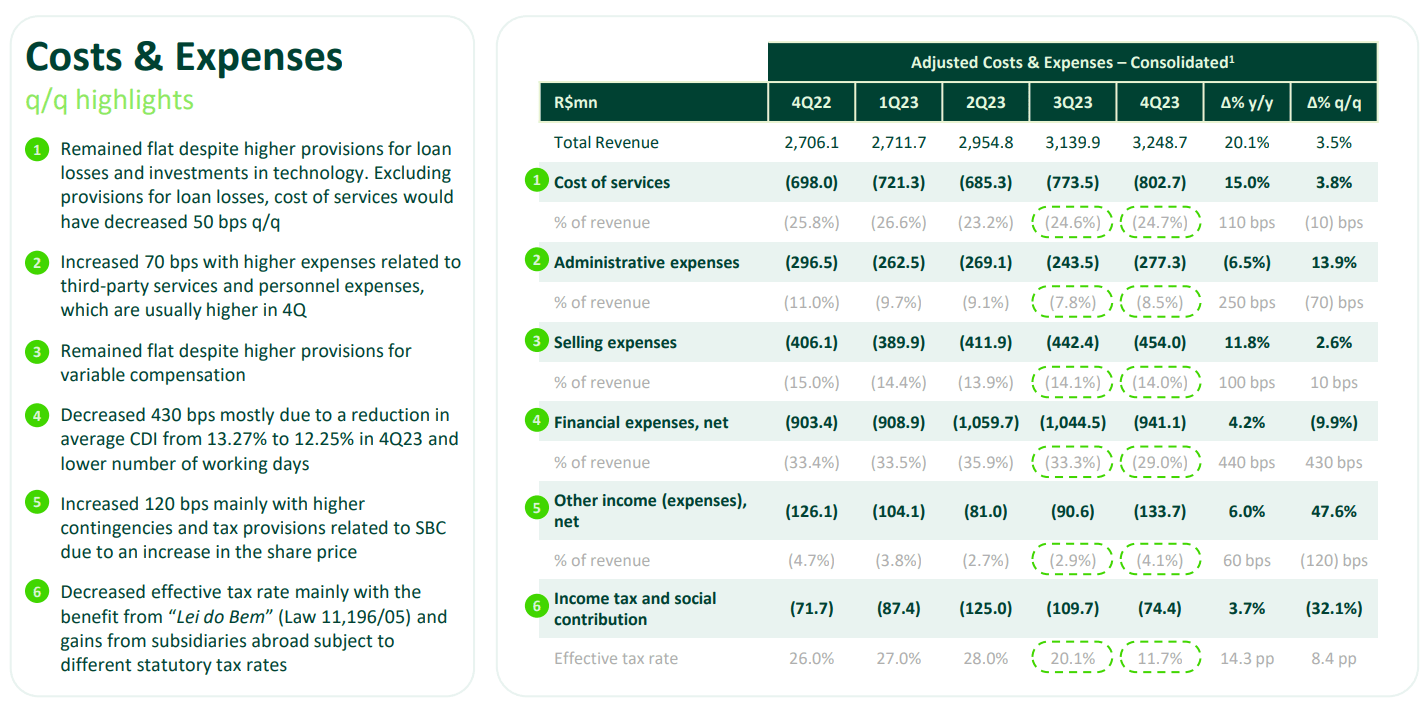 This is because its customer base has shifted toward smaller vendors, who are charged a higher percentage. However, in the fourth quarter, this shift toward smaller vendors did not continue according to management and won't repeat either in 2024... Yet, management expects the take rate to continue to increase, up to 2.49% in 2024. I believe this goes to show StoneCo's pricing power.