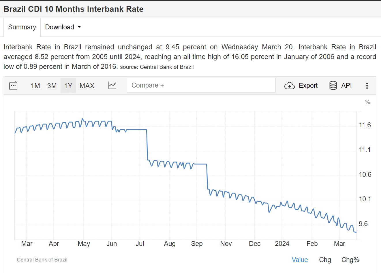 The decrease is mainly the result of the drop in Brazil's interbank rate. In that sense, it is great to see that this rate has continued to decrease throughout Q1 24: