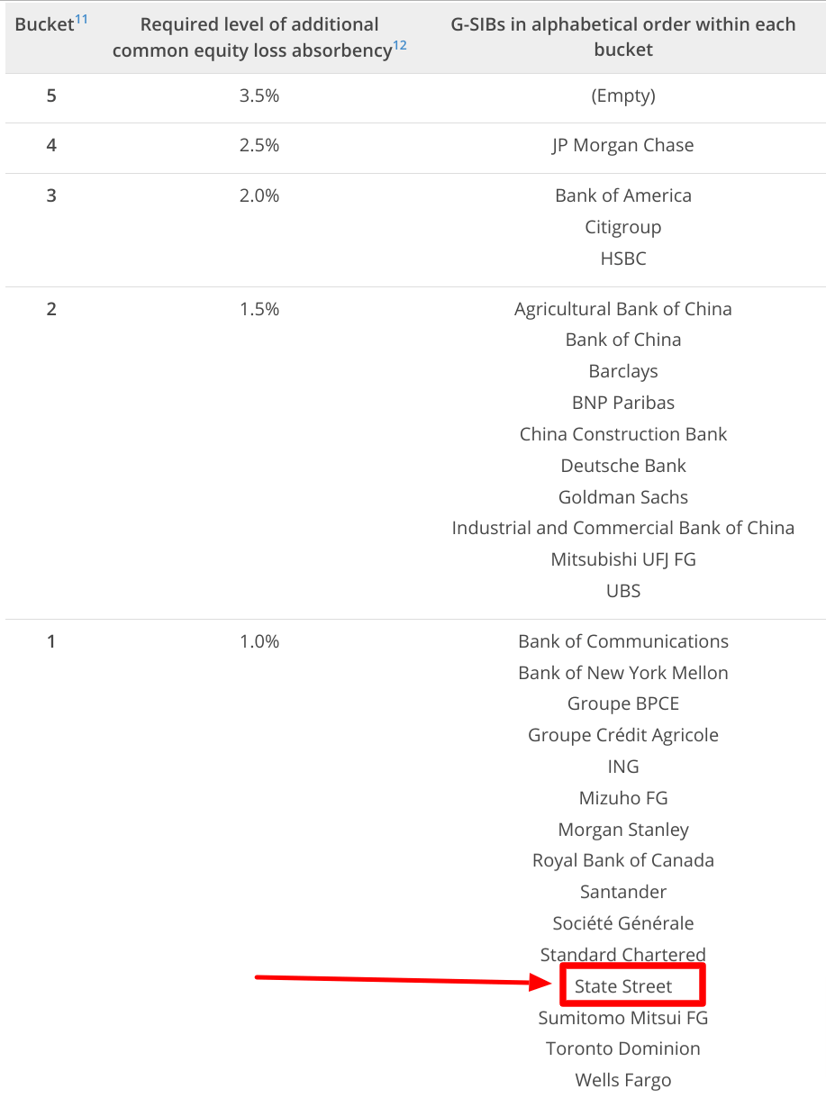 While State Street has a modest common stock market cap of $22B it's a Global Systemically Important Bank (GSIB), which is colloquially known as a "Too Big To Fail" bank. There are different buckets of GSIBs and STT is in the lowest rung along with Wells Fargo and Morgan Stanley.