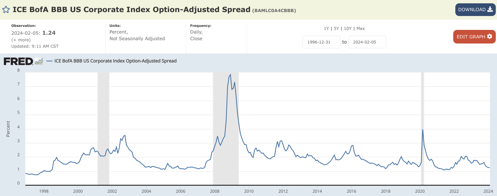 As the below chart shows, during recessionary periods, BBB spreads can get to 300 bps and beyond, at which point I would expect STT preferreds to trade significantly below par.