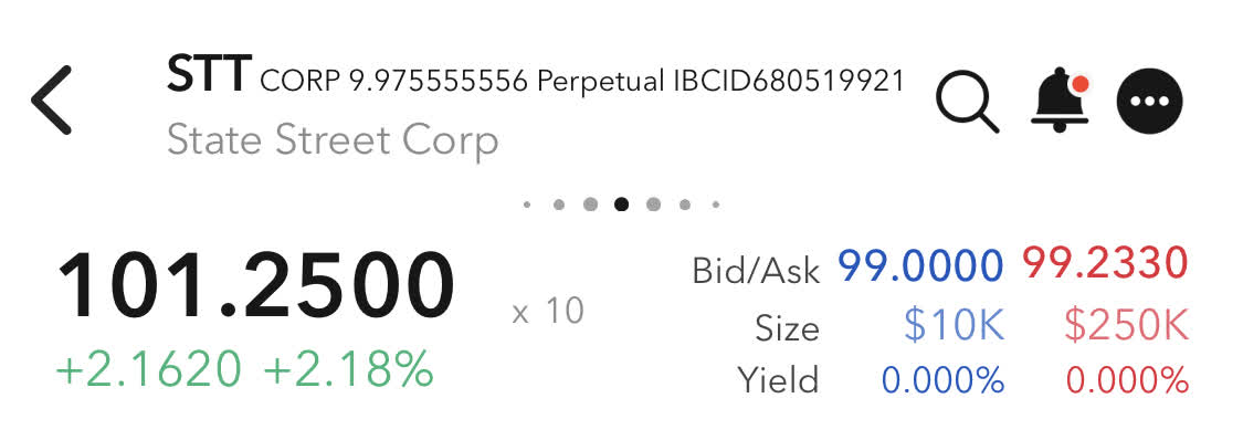 The extra 2.2% of yield provided by the STT preferreds is an attractive spread to their A1/A rated unsecured bonds. Typically, anything over 1.5% is attractive.