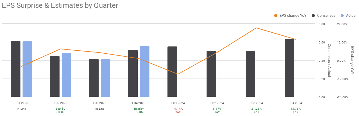 Teradata's latest quarter earnings were on 2/12/2024, and it beat GAAP estimates by $0.01, contributing to a full year of in-line and beaten consensus expectations: