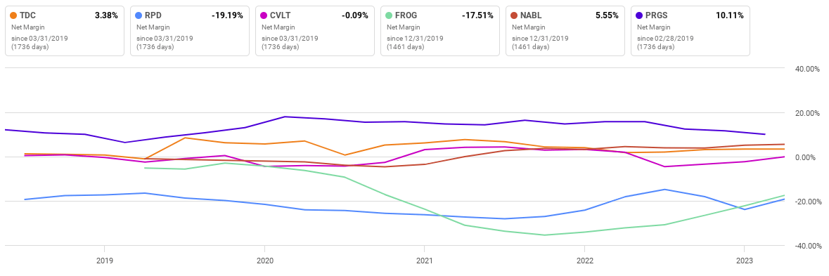 Teradata has a weak balance sheet at this time, with an equity-to-asset ratio of 0.07 and a debt-to-equity ratio of 4.74. Compare this to JFrog (FROG), which has an equity-to-asset ratio of 0.7 and a debt-to-equity ratio of just 0.03. Additionally, compare it to N-able (NABL), which has an equity-to-asset ratio of 0.61 and a debt-to-equity ratio of 0.53.