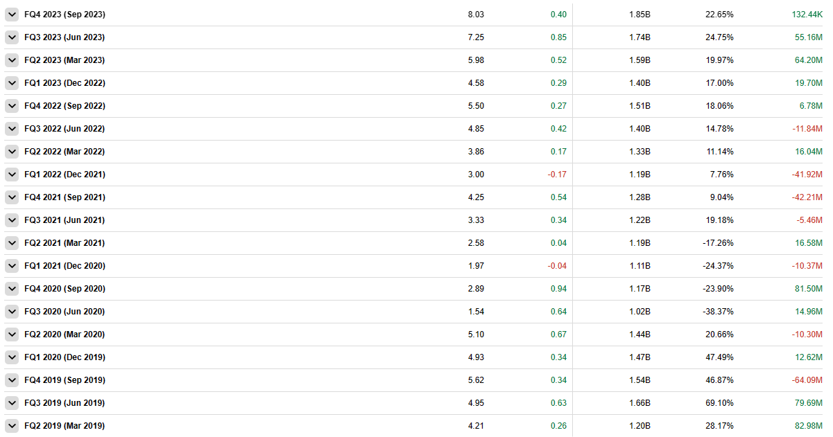 As for my outlook, I would expect revenue growth of 15%+ in the near term. This is consistent with the last five years of growth and is consistent with management's guidance for 20% growth in commercial OEM, mid-teens growth in the commercial aftermarket, and high-single digit growth in defense for 2024. Importantly, this guidance doesn't include any additional impact from new acquisitions yet to be announced. For an acquisitive company like TransDigm, it's likely that the company will exceed its own guidance. Historically, TransDigm has had a reputation for under-promising and overdelivering. Looking at the quarterly EPS figures over the last five years (20 quarters), there have been only two quarters when EPS came in below consensus estimates. While past performance is not an indicator of future results, great companies led by disciplined capital allocators tend to surprise to the upside long-term.