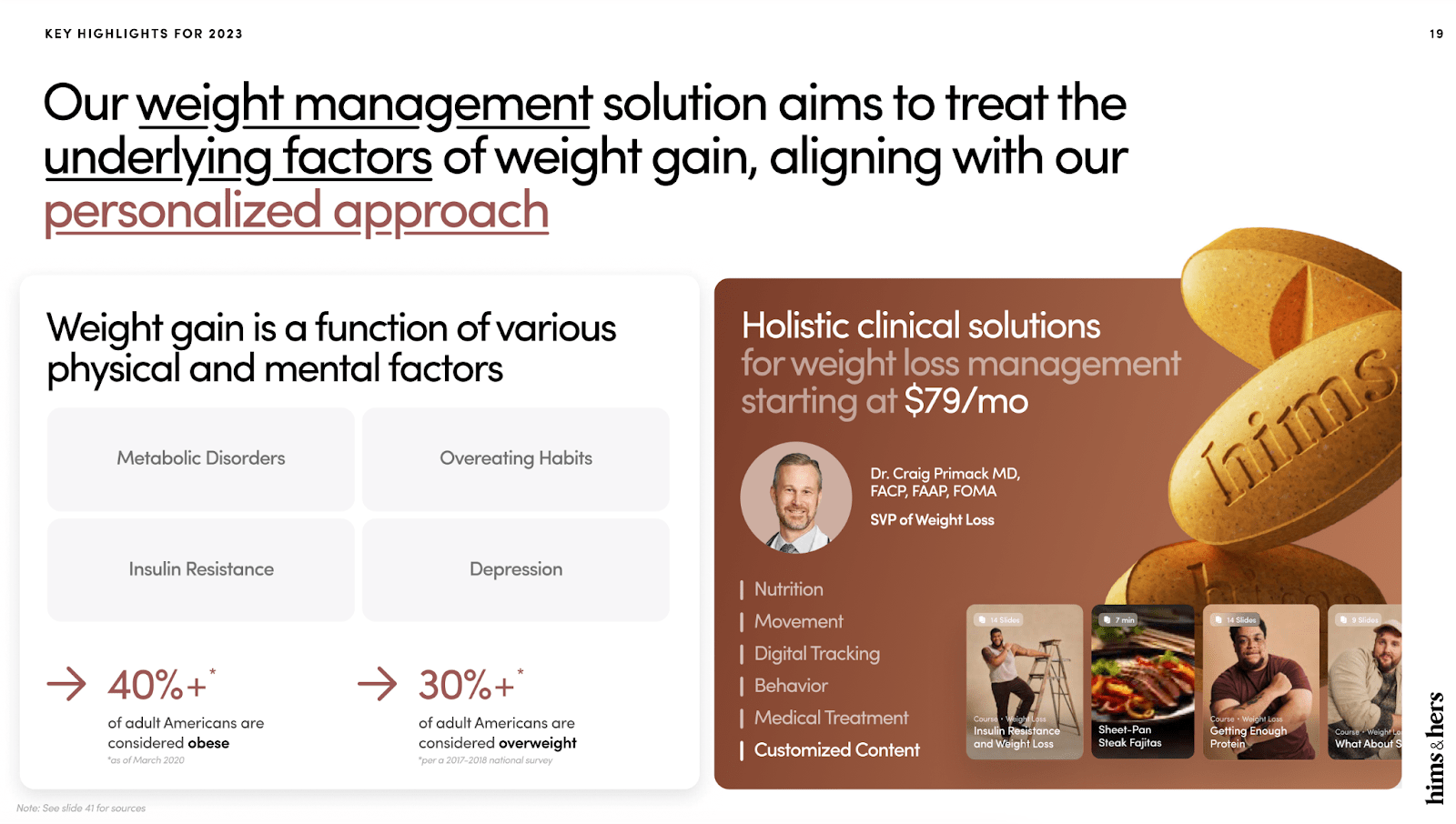 In 2023, for example, Hims launched Hard Mints in chewables in the men's sexual health category (which has already become a big hit among users and will drive meaningful growth for this category), Hair Blends in women's dermatology, the company's first multi-action offer in heart support, and the biggest of them all—a weight management offering, which offers personalized solutions designed around addressing the underlying causes of weight gain.