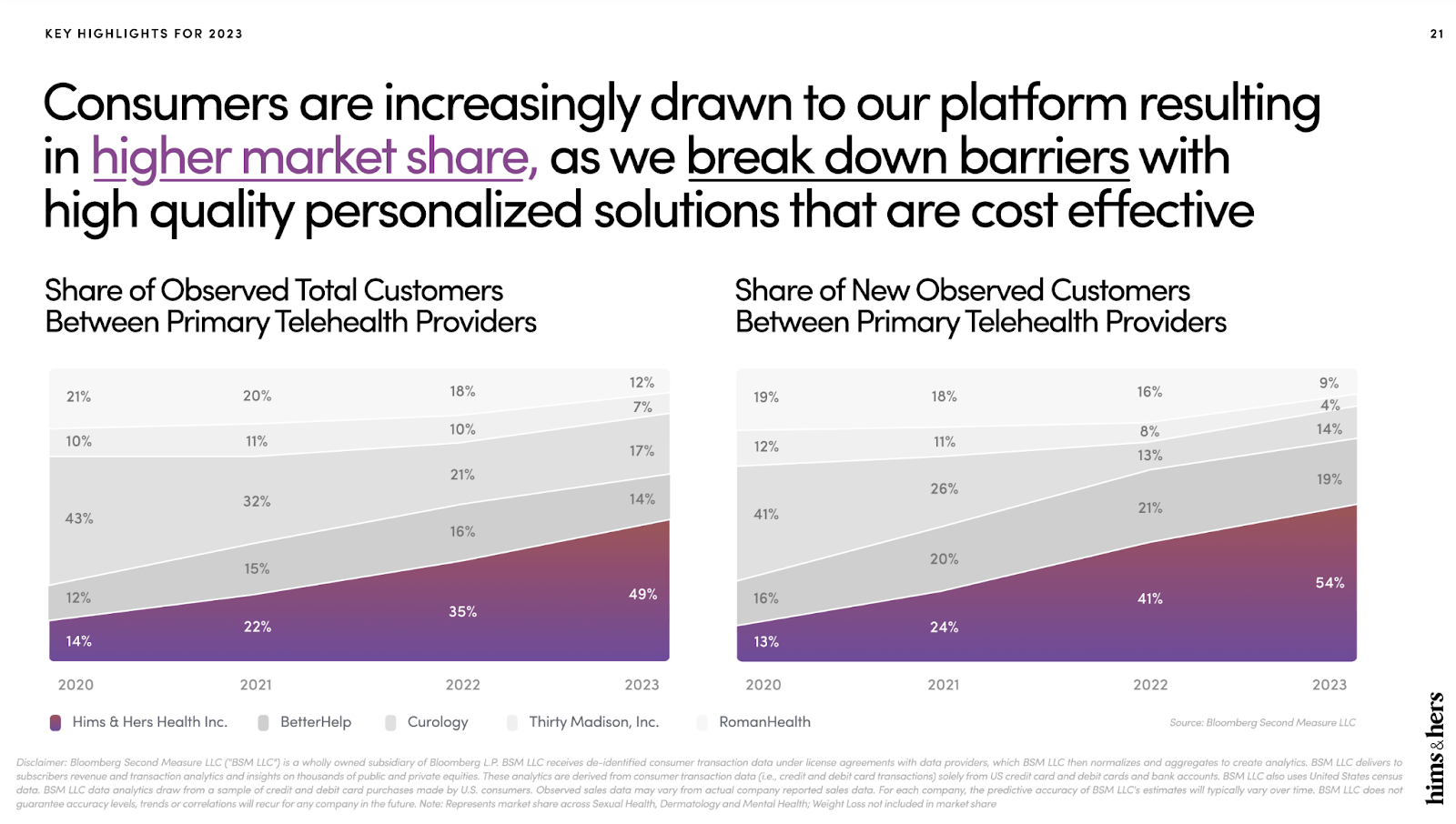 In reality, HIMS is gaining market share from other telehealth providers offering similar services and products, and it does so at an incredible rate. These are not the company's figures but rather Bloomberg's, and they speak for themselves.