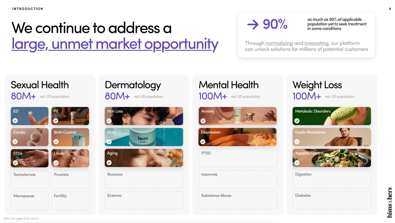Not only does each of these five specialties have room for category expansion (for example, in sexual health, fertility is a $5+ billion opportunity, or in mental health, insomnia is a condition suffered by at least 30% of the adult population in the U.S.), further extending its TAM and giving consumers greater access to a broader range of healthcare services and products, but also the company can continuously evolve its suite of offerings, leading to more initial sales and cross-sales among existing users.