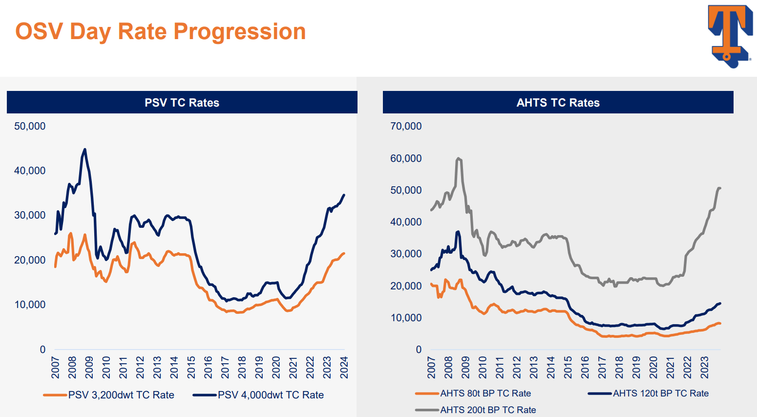 The company's vessel operating margin (equivalent to gross margin) of 47.2% and average day rate of $18,066 represented new multi-year highs thus resulting in vastly increased profitability with Adjusted EBITDA reaching $131.3 million.