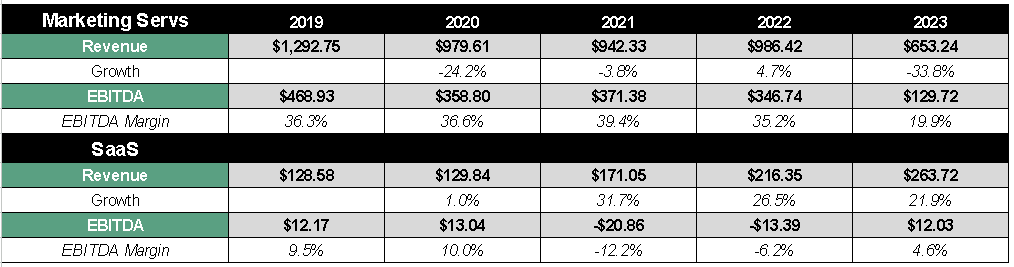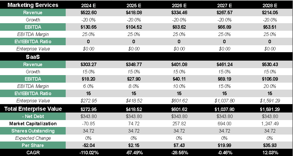 To answer this question, I will project the growth of each segment, value it individually due to its drastically opposite characteristics and then perform a sum-of-the-parts. To begin with, we can note the obvious: The Marketing segment (legacy business) is not growing. In fact, management comments that they expect it to continue decreasing by close to 20% annually, which is to be expected.