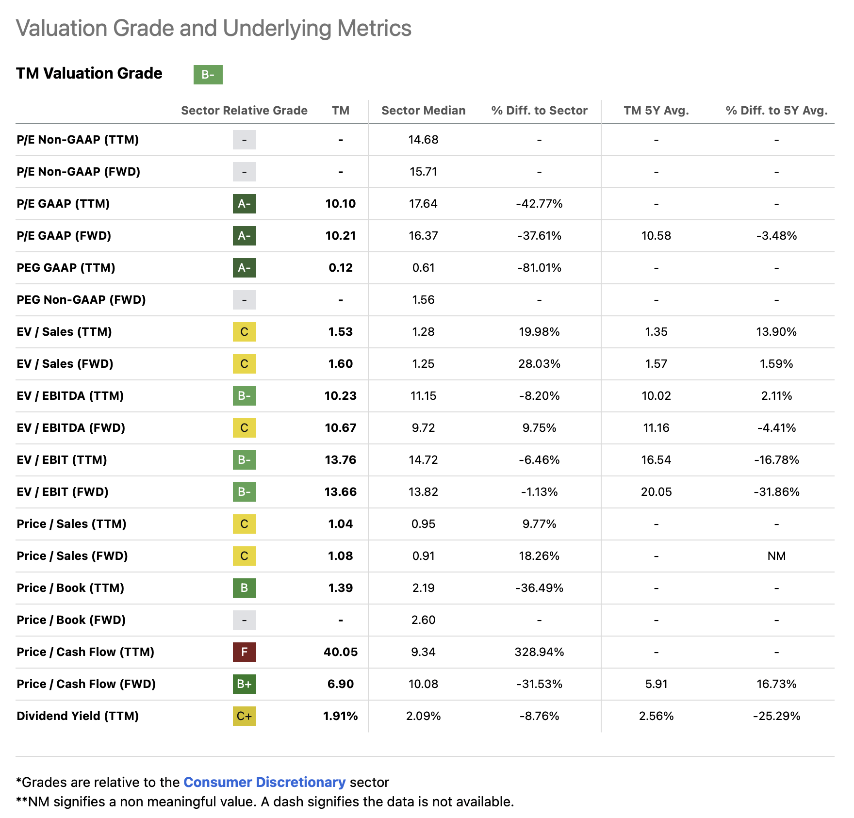 One of my favorite tools, the Seeking Alpha Premium Tool, assigns a valuation grade of B- to Toyota as of March 12: