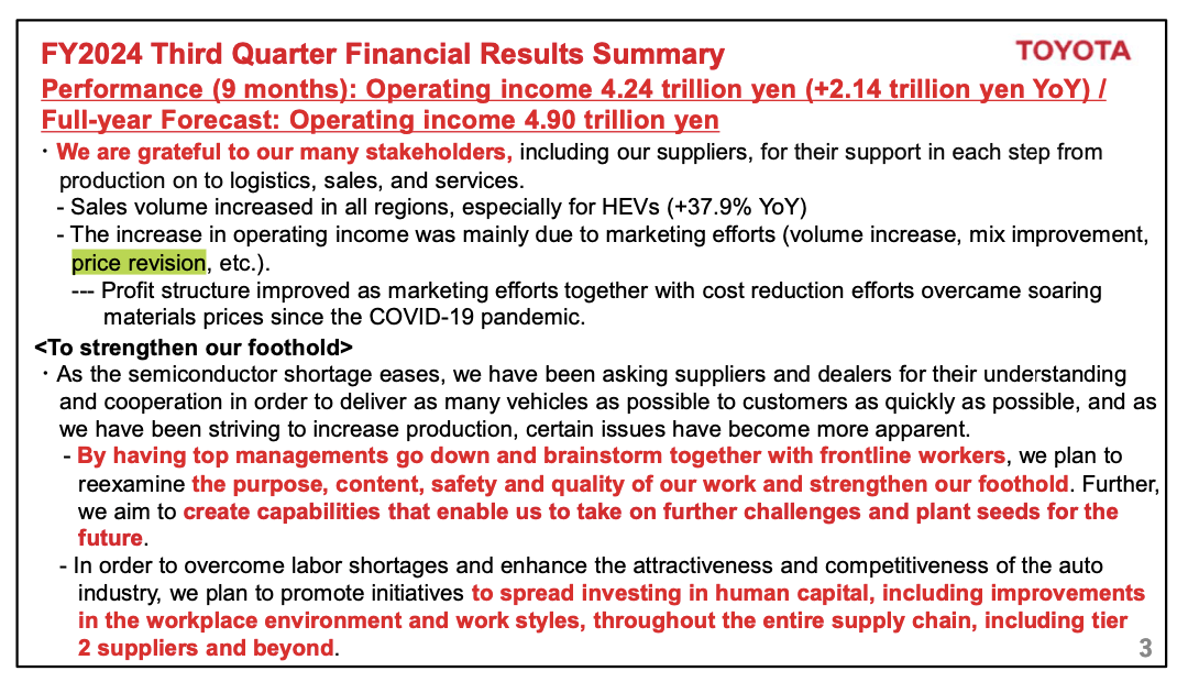 Toyota, on the other hand, has not needed to slash its prices at this time, and to the contrary, has implemented "price revisions" upward in light of rising material costs, as the company indicates in its most recent financial results: