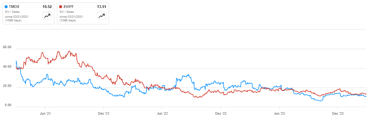 TransMedics' operating profit margin are improving rapidly on the back of strong growth and operating leverage. The company recorded its first profitable quarter in Q4 2023, although the margin was low and TransMedics had a sizeable loss for the full year. TransMedics should be profitable in 2024 and begin to achieve higher margins over the next few years. This improvement in profitability will likely be supportive of the share price in the near-term.