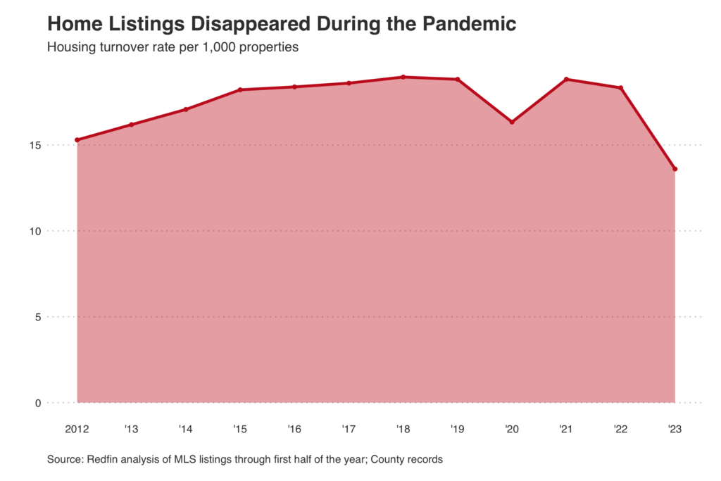 Roughly 14 of every 1,000 U.S. homes changed hands during the first six months of 2023, down from 19 of every 1,000 during the same period of 2019 and the lowest turnover rate in at least a decade. That means prospective homebuyers have 28% fewer homes to choose from than they did before the pandemic upended the U.S. housing market.